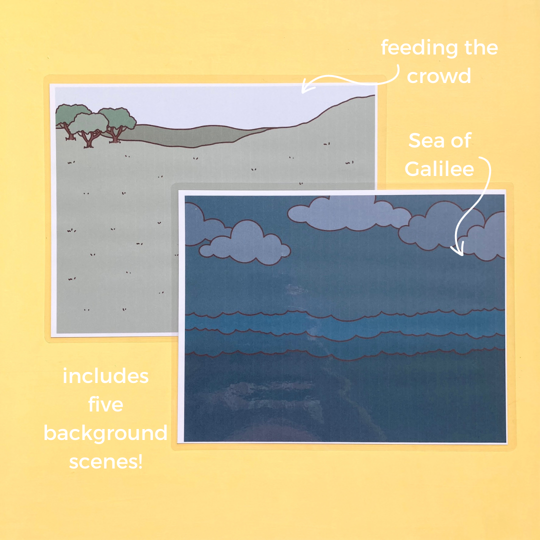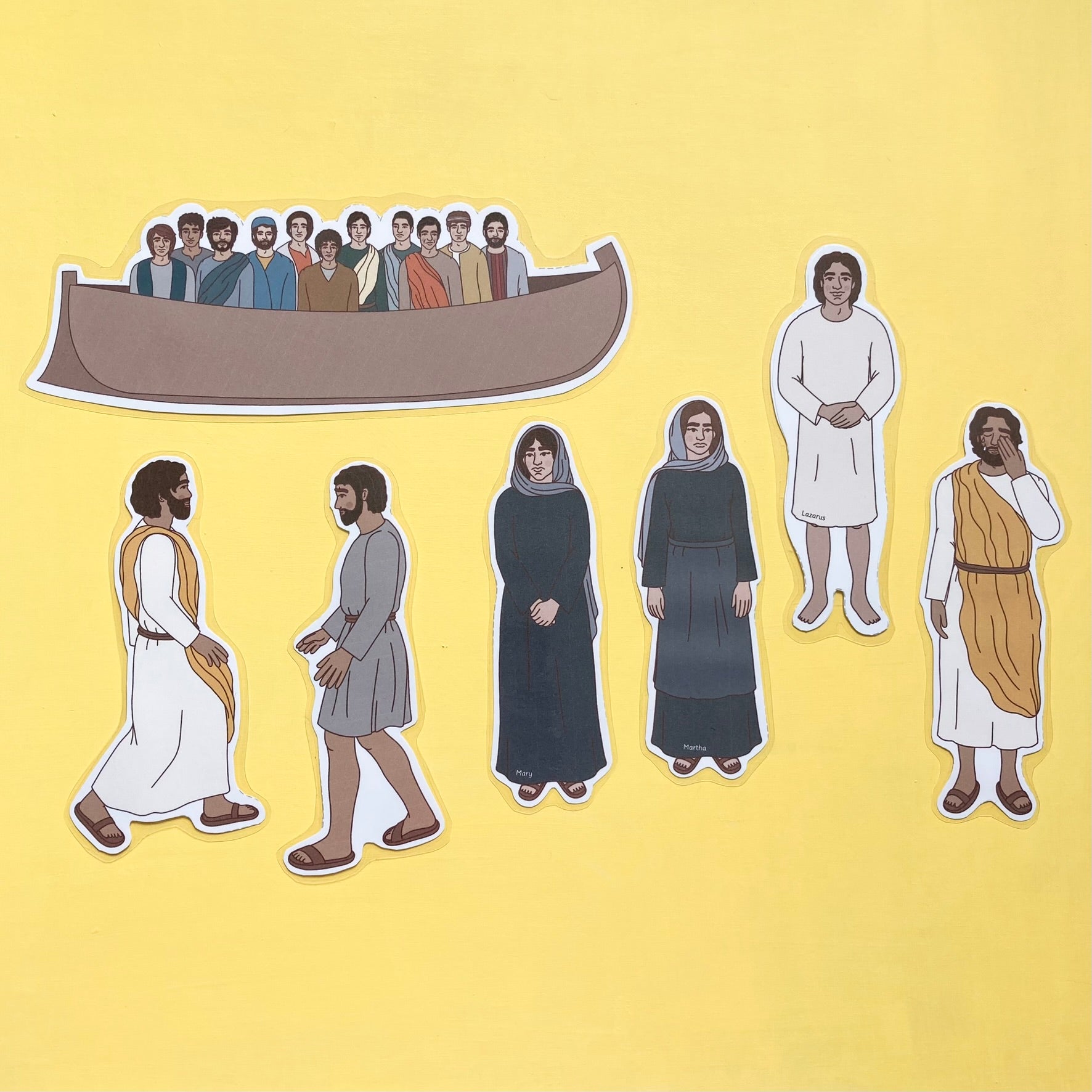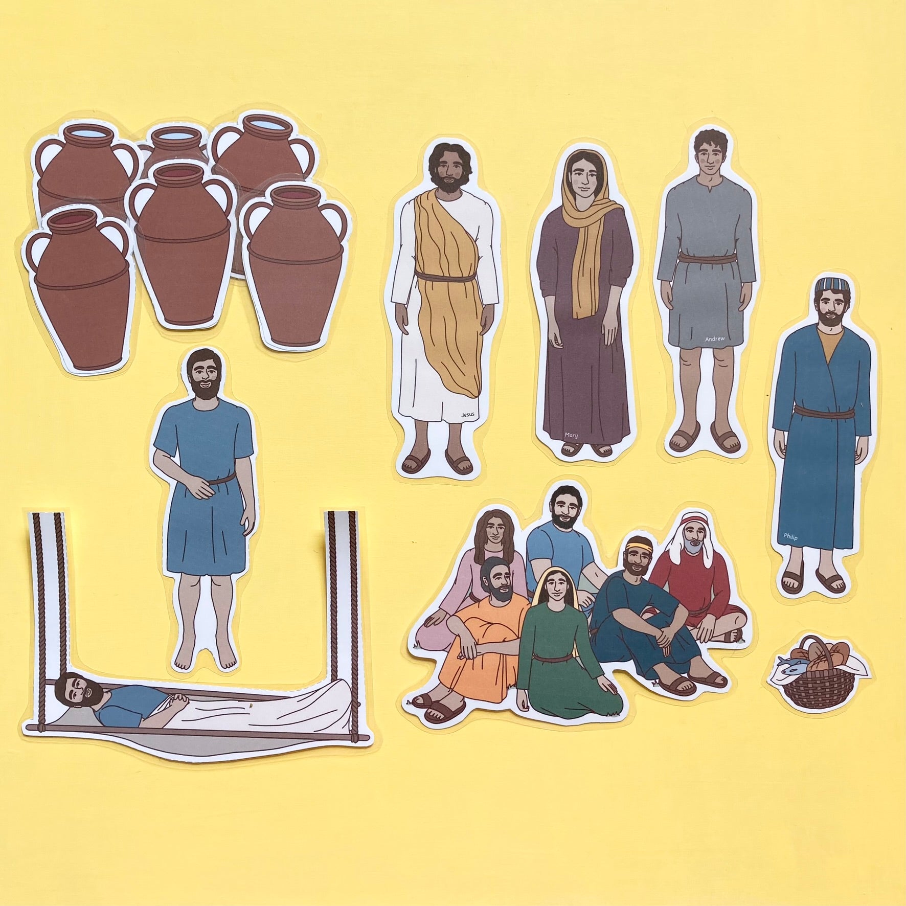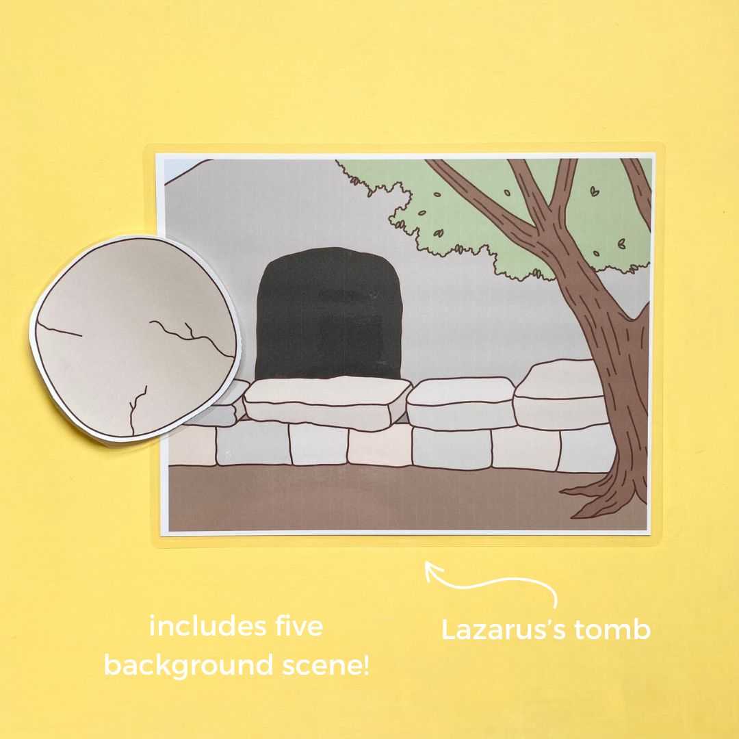 INCLUDED IN YOUR PURCHASE: You will receive (1) PDF that includes five background scenes, props, and illustrations of Jesus, Mary, the paralyzed man, a crowd of disciples, Philip, Andrew, Peter, Mary, Martha, and Lazarus.