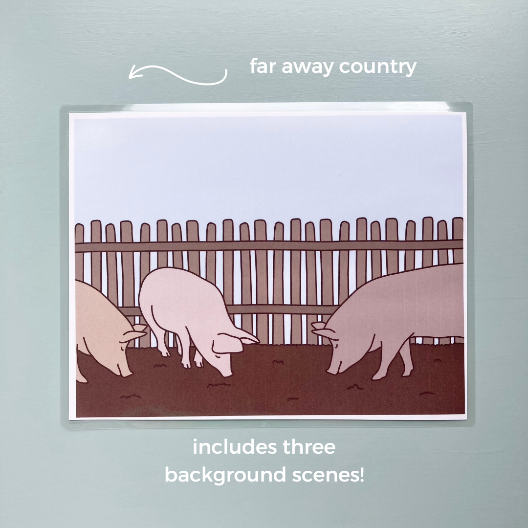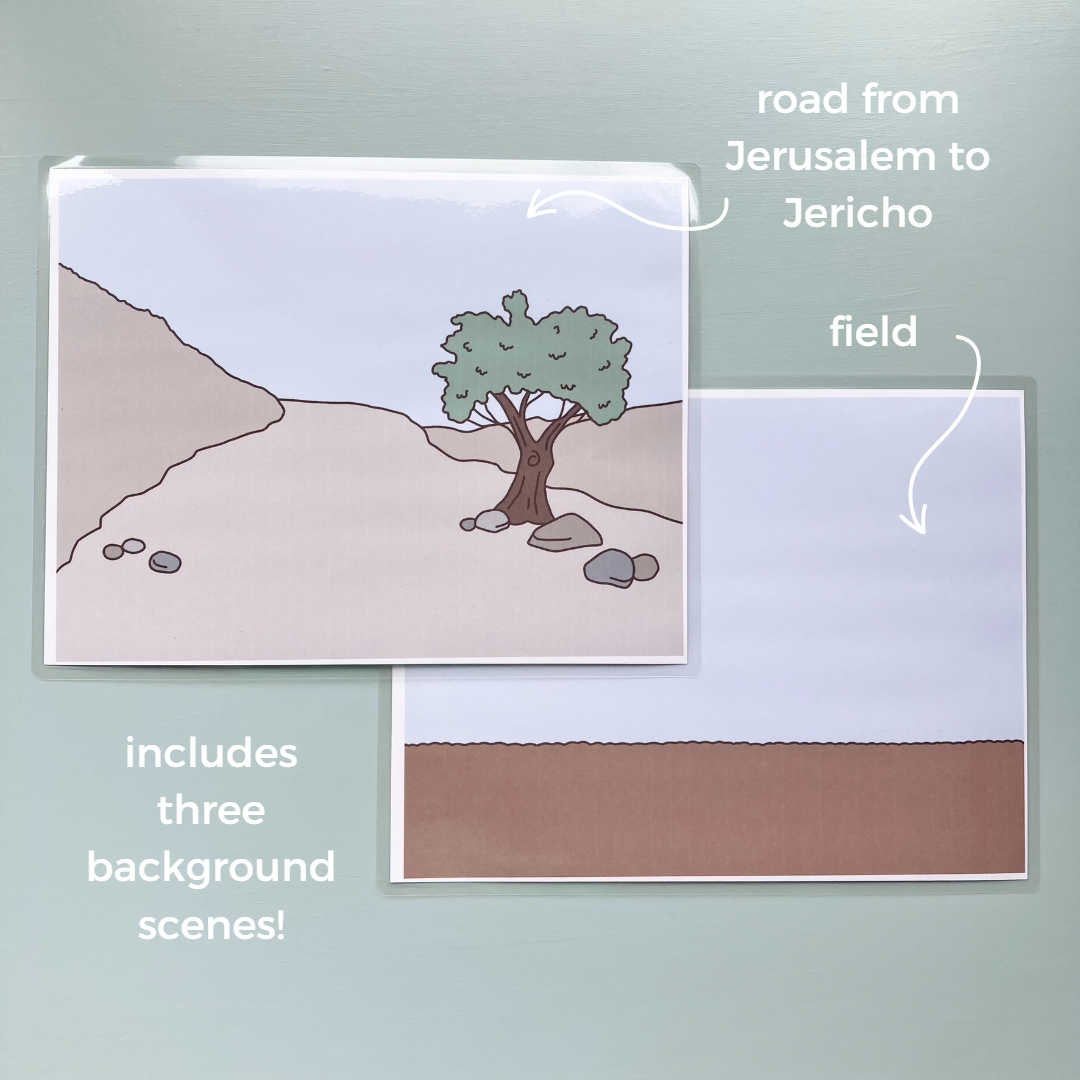 INCLUDED IN YOUR PURCHASE: You will receive (1) PDF that includes three background scenes, props, and illustrations of the parable of the good Samaritan, the sower, and the prodigal son.